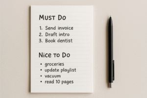 Long to-do lists become avoidance lists. The two-line method forces clarity without fancy apps.